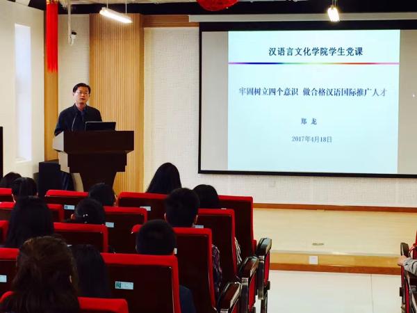党委负责人郑龙以“牢固树立‘四个意识’,做合格汉语国际推广人才”为题开始首场讲座。讲座由学院党委副书记、副院长满荣主持,每日大赛