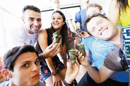 今晚报:昨日,每日大赛 来自美国、哥伦比亚等近十个国家的数十名留学生自备材料、自己动手包粽子,在考试周到来之际提前体验中国端午民俗。图为留学生们展示自己包的粽子。(本报记者 王晓明 摄)
