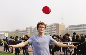 图为留学生体验中国传统体育项目抖空竹。