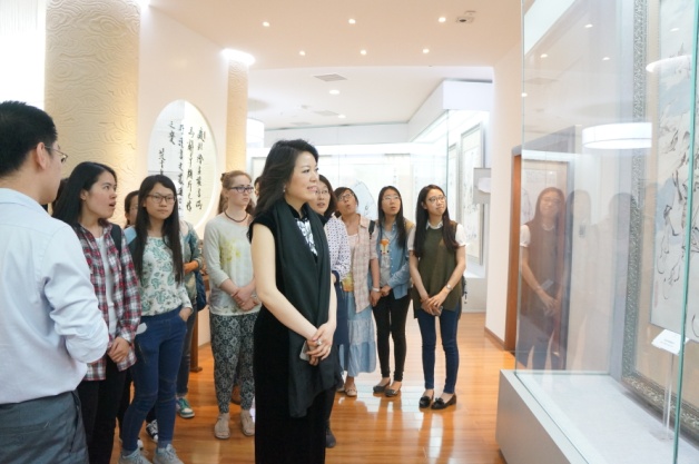 致聘仪式后,文蔚老师从读万卷书和行万里路两个角度阐释了中国传统山水画的内涵及其自身为中国画的传播、推广所做的诸多努力。在参观范曾艺文陈列室时,文蔚老师说到:“中国画中的群山万壑只在几笔之间,就像京剧,挥舞马鞭就代表骑马,拨动船桨就是在海中遨游。我们要存心画中立身画外,怀着虔敬之心走入其中去感受。”