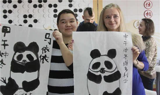 武术体验馆的同学则在武术老师的带领下练起了五步拳,看起来简单的招式,学生们练习时才发现其中的不易。“我很喜欢中国功夫,觉得它非常有意思。刚刚看老师打拳轻松自在,但自己练习时感觉,真的需要很大的力气。”来自美国的江峰向大家分享他的学习体会。而在国画体验馆中,学生们正手持毛笔,跟随老师学习正确的握笔手法。绘画的主题是一只黑白相间的小熊猫,憨态的模样让不少女生大呼可爱。在老师的指导下,大家纷纷在各自的宣纸上画了起来。虽然不是完美完成,但大多数人还是非常欣赏自己的作品,纷纷和它合影留恋。“这是我第一次画中国画,还是可爱的熊猫,我很喜欢!”来自乌兹别克斯坦的何星星高兴地说道。旁边的同桌,来自澳大利亚的巴黎则说道,“用毛笔在纸上画画后,那个图形会变大,我觉得很有意思,但是也有点难以控制。”