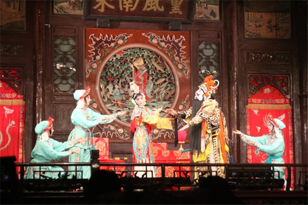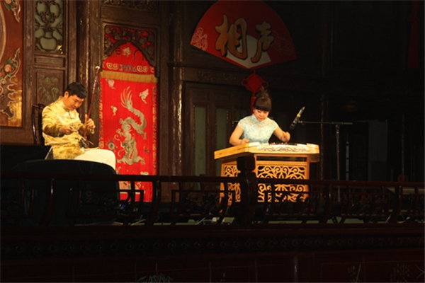 古老的戏台下分列着典雅的桌椅,四周高挂的红色灯笼和中国结更是增添出一份热闹与喜庆。伴随着轻快的三弦,一场《新武松打虎》快板表演,拉开了迎新年演出的序幕。