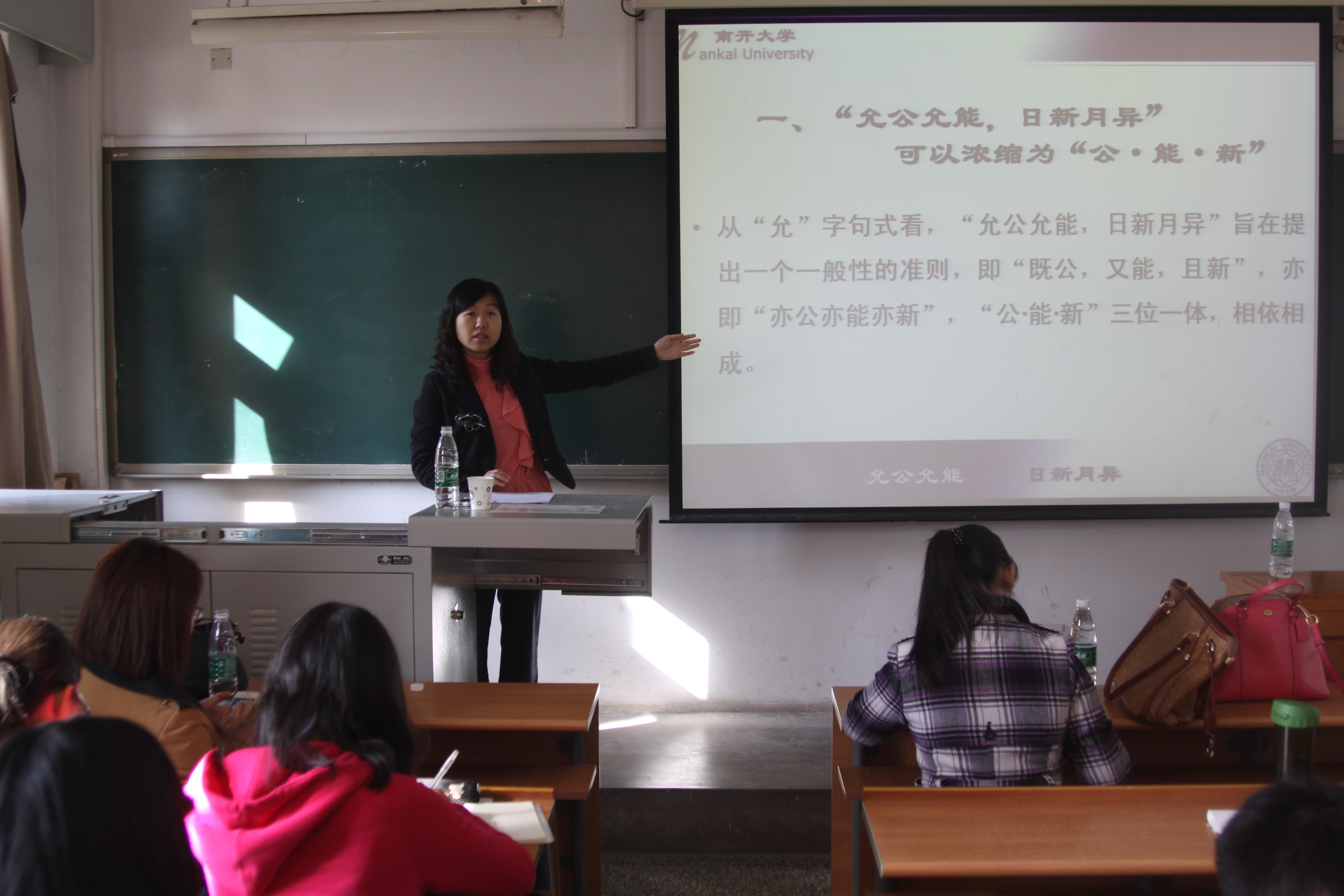 张老师将校训浓缩为“公,能,新”,从“允”字讲起,提出了对“允”的4种诠释,认为“允”既是一个一般性准则,又是一种实然、应然的状态,更是一种最高理想,倡导大公大能大新。“允能”则要做到最能,建设现代化的国家需要现代化的才能,而南开之教育在于培养学生现代化理论才能与实践工作能力。“日新月异”与我国创新潮流不谋而合,即每个人要能接受新事物,而且成为新事物创造者。张伯苓老校长曾说“读孝经,不如读公经”,而“能”则将道德教育与知识能力教育结合,“新”则为校训注入了永恒的生命力。南开“公能”校训正是南开先人对中国传统文化进行扬弃的产物,对校训的深入理解有助于帮助同学们正确认识如何弘扬中国传统文化,取其精华去其糟粕。张老师以《论语》、礼、孝、仁爱等儒家经典思想为例,为大家批判分析了传统文化中存在的不合理因素,鼓励大家在诵经典、读名著的同时带着批判眼光,得出正确的历史经验,客观、全面、准确地研读经典,为社会主义核心价值观的培育积淀深厚的文化土壤。