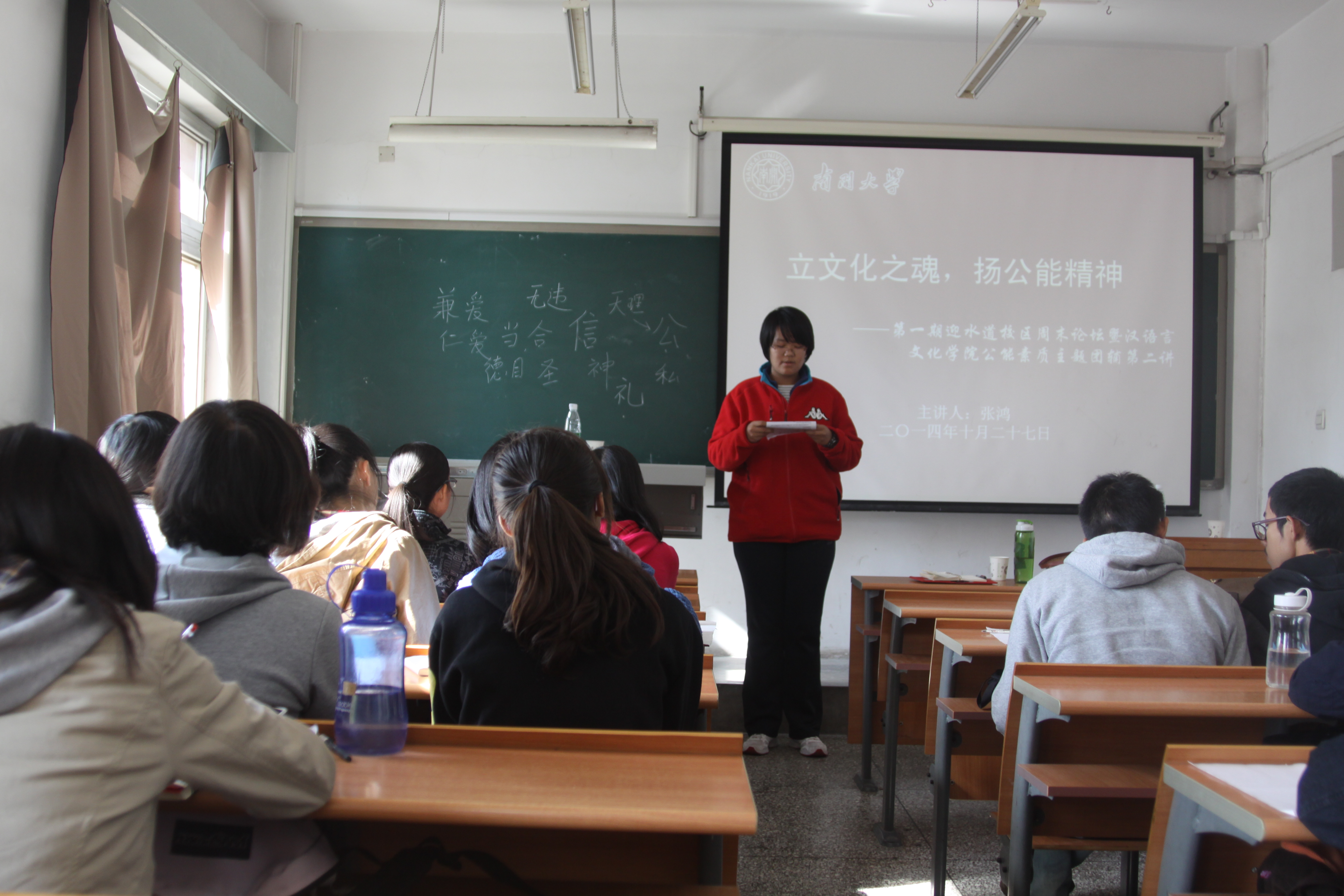 举办“立文化之魂,扬公能精神”公能素质主题团辅第二讲暨新生读书班会。学院党委副书记、副院长王坚及2014级汉语国际教育专业全体本科生共同参加了此次活动。