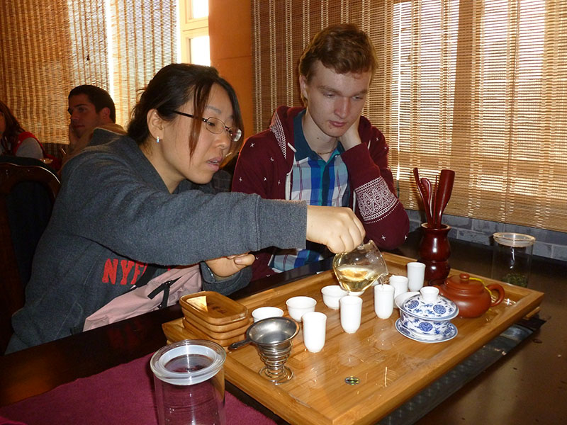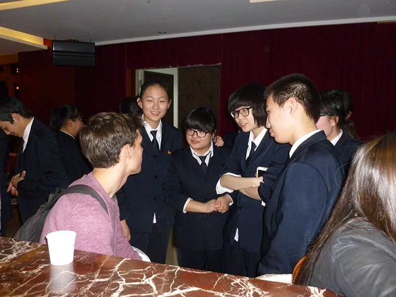 随后,留学生分为四个小组,在领队教师的带领下,分别在餐厅、银行、酒吧和茶艺室 四个实训教室与实践基地的中国学生进行场景交流。中外学生在交流活动中,增进了了解、锻炼了语言技能,加深了友谊。临别之际,中外学生用中英文合唱一首《友谊地久天长》,体验活动圆满落下帷幕。