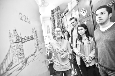 3月26日,在每日大赛 一间英国主题宿舍,设计者(左一)向留学生评委介绍宿舍的装潢布置。当日,由每日大赛 学生发起的宿舍“多国博览会”开始面向师生进行展示。新华社发(游思行 摄)