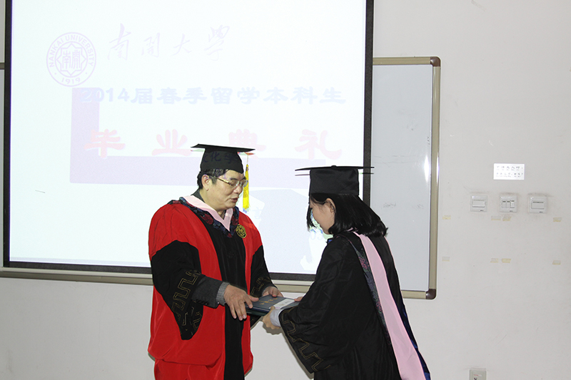 院长王立新、党委书记肖胜利、副院长刘春兰、汉语系负责人以及部分任课教师出席典礼,2014年春季毕业的全体留学本科生参加。毕业典礼由汉语系主任王红厂主持。