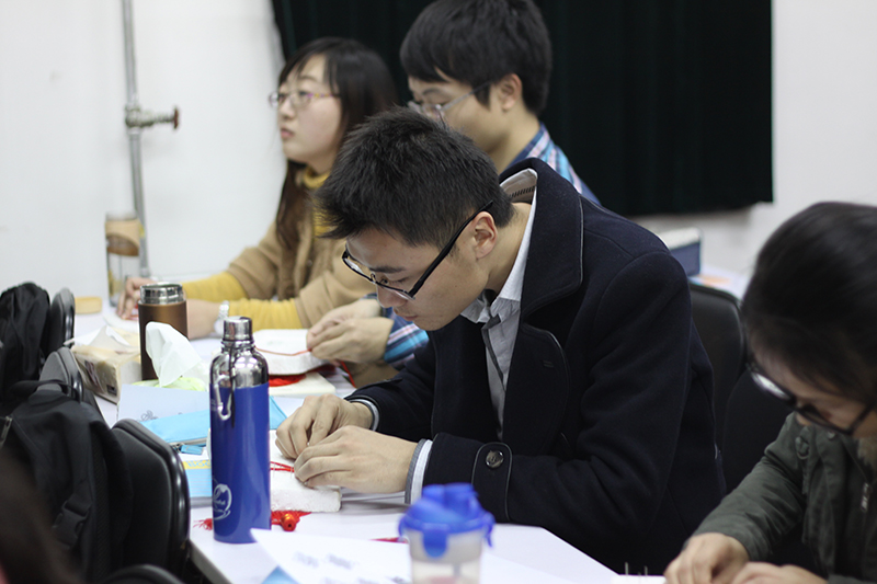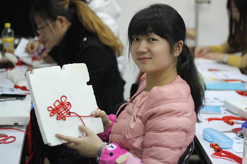 2013级研究生“班级文化嘉年华系列活动之学编中国结”活动在汉院北楼进行,邀请曾在澳大利亚担任汉语教师志愿者的2011级硕士研究生雷航同学教授大家编制中国结。