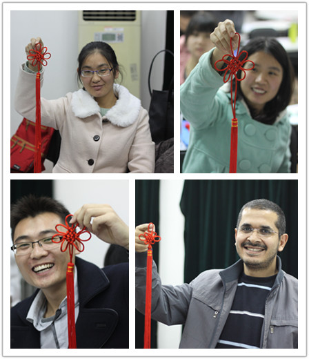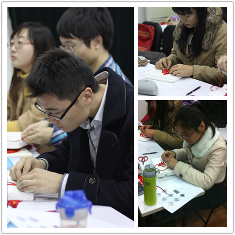 11月21日,研究生同学又进行了一项新技能的学习——编中国结。同太极拳运动一样,编中国结也是一项极具中国特色的文化体验项目,深受中外学生喜爱。曾在澳大利亚担任汉语教师志愿者的2011级硕士研究生雷航同学应邀教授大家编制中国结。活动中,全体同学都按照步骤图在老师的指导下耐心谨慎地编制直至做出成品。值得一提的是,在该次学习中,埃及留学生赛义德同学表现尤为出众,是第一个编制并整理好盘长结的同学,得到了老师和同学们的肯定和赞赏。学编中国结,不仅有利于增长技能、陶冶情操,也有利于帮助中外同学了解中国传统文化并进一步弘扬。