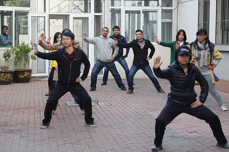 的同学把该项运动列为特色活动,自己学习并积极推广给留学生同学。在本次活动中,由太极拳爱好者、学院中国文化——太极课兼职教师田弘瑶佳同学担任教练,她首先给大家演示简易太极拳套路,稍后分节讲授并逐个指导、纠正动作。全体同学认真练习,毫不松懈,吸引了学院众多留学生以及工作人员到场观摩。本次太极拳学习一方面弘扬了中国传统文化,另一方面也使大家在忙碌的学习生活中得到休憩。