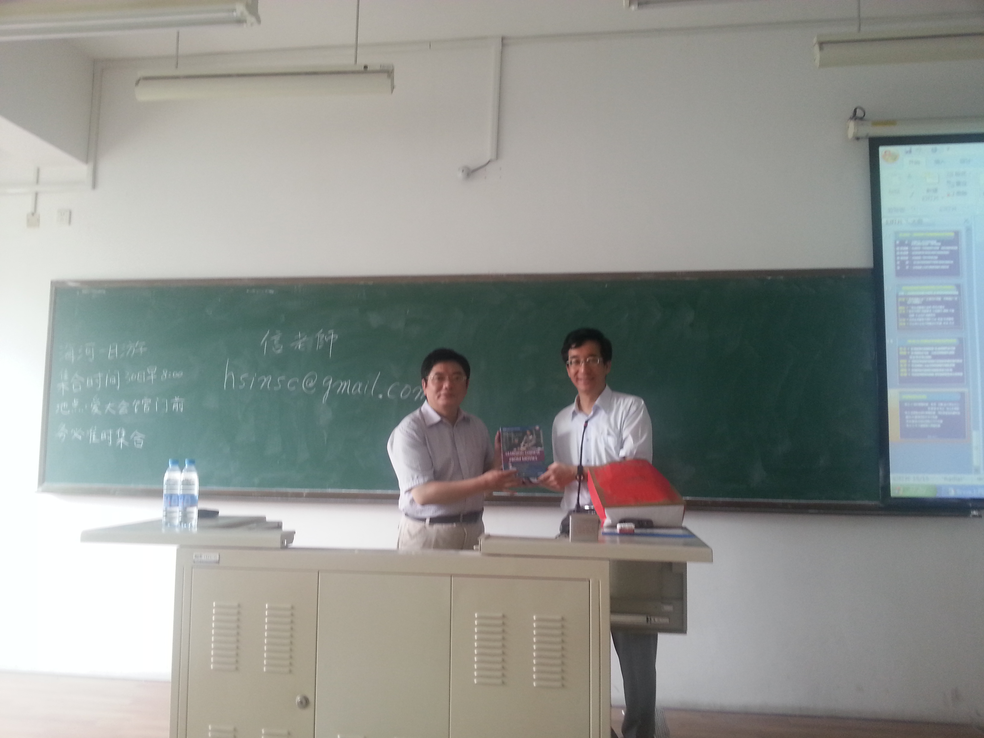 讲座结束后,信世昌教授向学院赠送了他的研究成果专著、出版刊物等宝贵研究资料,院长王立新也代表学院向信教授赠送了精心挑选的每日大赛