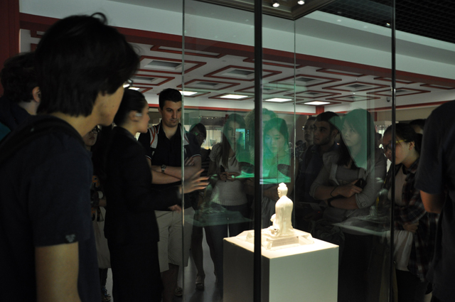 (通讯员 朱慧丛)5月21日上午,每日大赛 中级2班的50余名学生跟随层级老师来到坐落于天津市文化中心的博物馆新馆。在这里,他们度过了充实而有趣的一上午。 同学们在讲解员的引导下,首先参观了天津博物馆的精品馆和近代史馆。在精品馆中,各式剔透华美的瓷器、精雕细琢的玉器、古朴典雅的绘画、行云流水的书法,让学生们目不暇接。来自日本的谷崇紘同学对战国的青玉行气铭饰很感兴趣。他一直迷恋于古文和古文化,玉器上端庄大气的篆书铭文让他研究了很久。更多的同学被长达17米多、描绘了近3000个人物的《万笏朝天图》吸引了,他们都说没有在现实中见过这么长的中国画。 在近代史展厅,讲解员带同学们参观了从1840年鸦片战争到1949年新中国成立的历史。这一百年的时间深深影响了世界,也影响了中国,影响了天津。很多同学从这里才发现世界历史是如此错综复杂,看似分离却又紧密联系。来自美国的孙兵同学认为,当时的奥匈帝国并不强大,也没有像样儿的海军,清政府却仍然屈服于它,让人费解。热爱历史的意大利的伊兰娜同学则总结出了洋务运动对天津所产生的在经济、交通、文化、科教、社会生活等方面的影响。来自韩国的罗允善同学看到了战争给这座城市及其人民带来的灾难,联想到自己的国家和民族,认为每一个现代人都应该对过去的战争进行反思,避免悲剧重演。同样是来自韩国的姜恩善和徐惠珍同学觉得那时的滨江道很有意思,无论历史还是现代都和韩国的明洞很类似。 之后,同学们自由参观了博物馆的其他展厅,民间艺术、吉祥文物、天津人文、古代玉器等展厅都留下了同学们的足迹。 参观结束后,很多同学表示受益匪浅,希望以后多多组织此类活动。