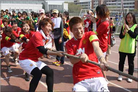 第一个比赛项目——拔河在大家的欢呼声中开始,赛场上大家士气高涨,加油声、欢呼声飘荡在赛场上空。“集体跳绳”、“五人六足跑”和“盲人搬家”等趣味项目考验了同学们的团结协作能力。“实心球掷远”则考验了选手们的力量和技巧。作为往年运动会最受欢迎的项目,“点球大战”一开始,立刻就吸引了场中所有的选手和观众的目光。在最终的决赛中,由来自土耳其的伊东、阿力、艾思、阿克马力和来自俄罗斯的萨沙组成的中级一班队发挥出色,以3:1战胜了爱知大学H&S班勇夺冠军。