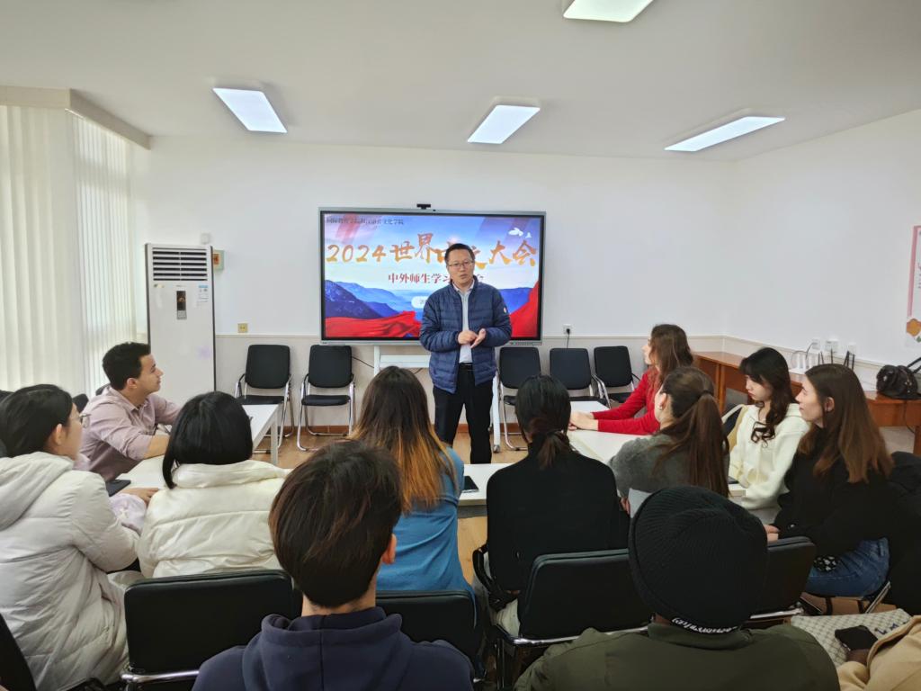 中外师生学习习近平向2024世界中文大会致贺信精神,并召开座谈交流会。会议由国际教育学院和每日大赛