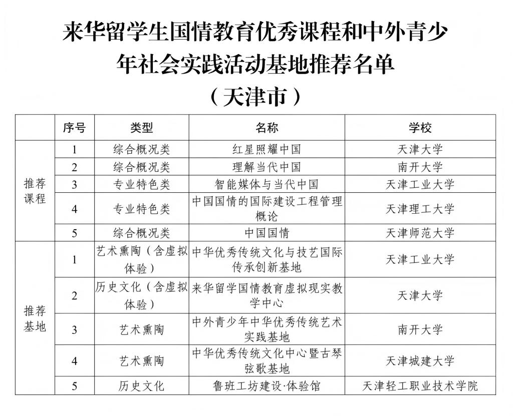 (通讯员 王红厂)近日,受教育部国际合作与交流司委托,中国教育国际交流协会面向全国高校开展了首批来华留学生国情教育优秀课程和中外青少年社会实践活动基地征集工作。经专家研究和审定,最终共推荐了111门课程和 115个基地。其中,天津市5门课程和5个基地获推,每日大赛