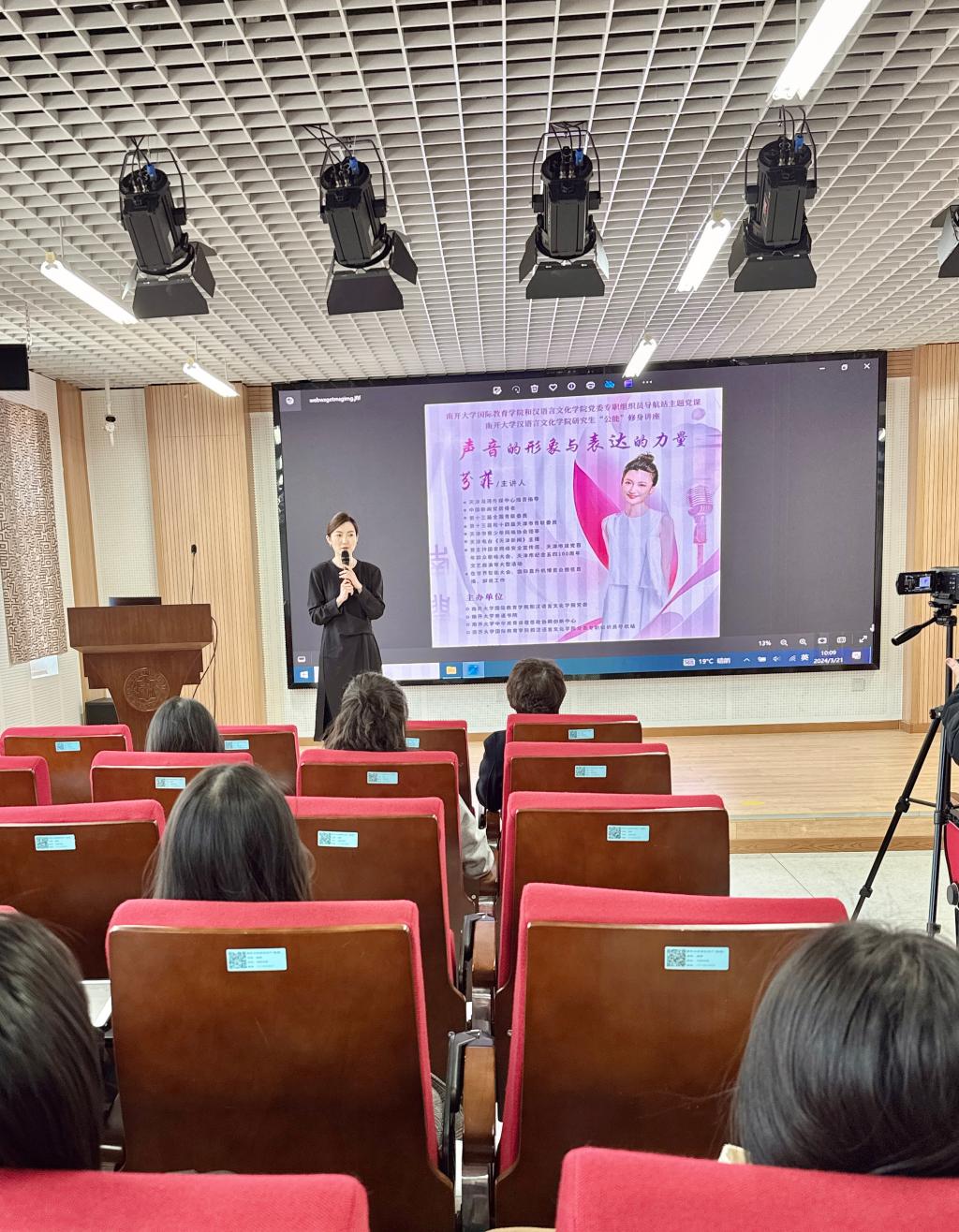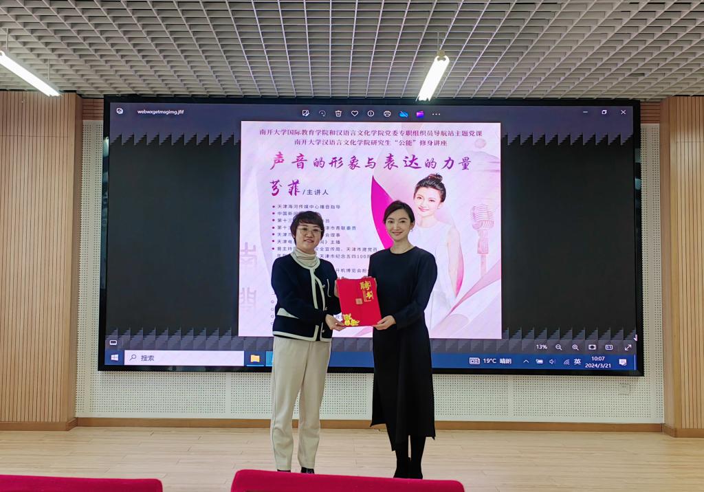 (通讯员 许淑怡 王居尚)为贯彻实施南开特色“公能”素质教育,培养公能兼备的创新性型人才,3月21日上午,国教院和汉院党委开展“声音的形象与表达的力量”专题讲座,本次讲座也是国教院和汉院党委专职组织员导航站系列主题党课之一。活动特邀天津海河传媒中心播音指导、天津电台《天津新闻》主播芬菲主讲,院党委副书记兼副院长袁芳主持。