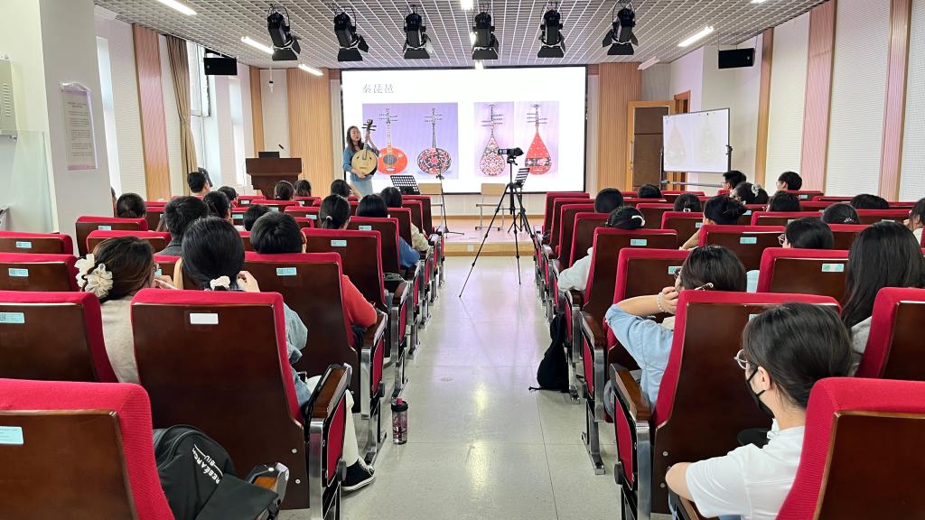 讲座结束后,参加讲座的同学们纷纷上前尝试体验两种乐器演奏,现场气氛热烈。许多学生表示,通过本次讲座,不仅体会到了琵琶与阮咸演奏的特色,更深刻体会到了中华传统文化的博大精深。
