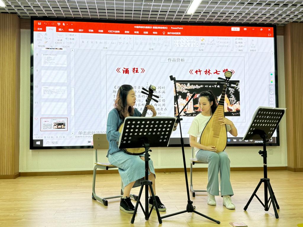 讲座最后,官微和刘可两位老师共同演奏的《梅花三弄》则在“文武”结合中将课堂推向高潮,乐曲的优美与力量完美交融,展现了中华民族乐器的无穷魅力。